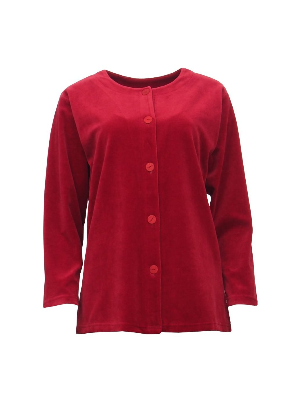 Dámska pohodlná plyšová domáca súprava v tmavočervenej farbe. Materiál je mäkký a príjemný na dotyk. Vrchný diel je rozopínateľný a v bočných častiach doplnený krátkymi rázporkami. Nohavice sú rovné, pásec je spracovaný do gumy. Guma je vymeniteľná. Súprava je vhodná ako domáce oblečenie.