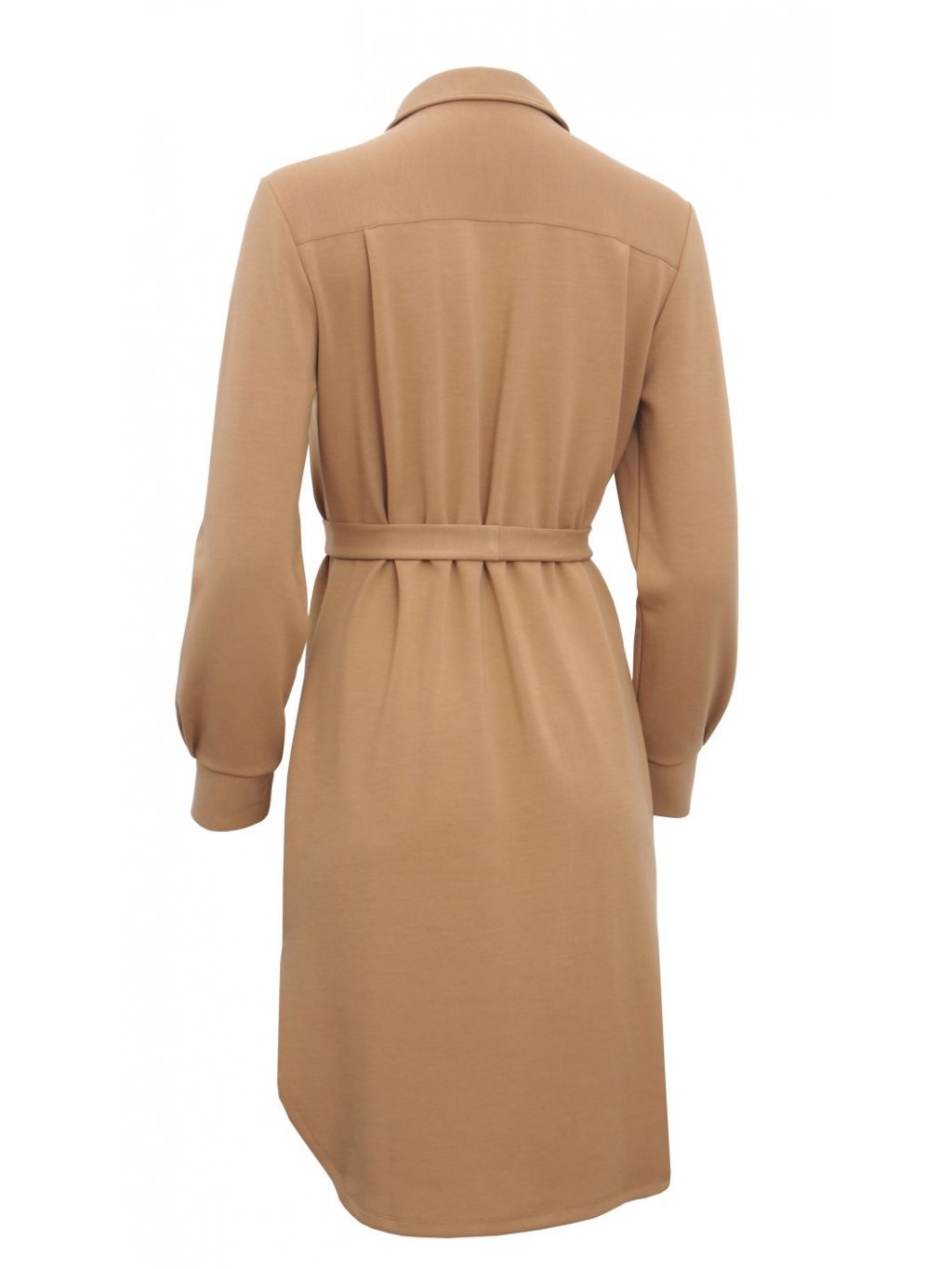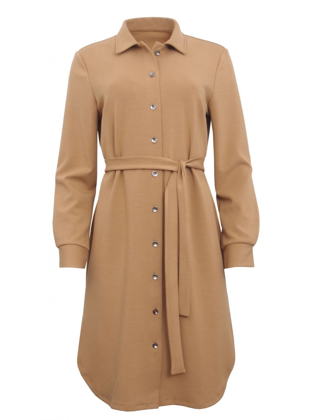 Košeľové šaty v hnedej farbe majú predné zapínanie na kovové gombíky v tmavých tónoch, dlhý rukáv ukončený na manžetu a spodný tvarovaný lem. Šaty sú doplnené opaskom. Šaty sú vyrobené z príjemného a mäkkého úpletu.