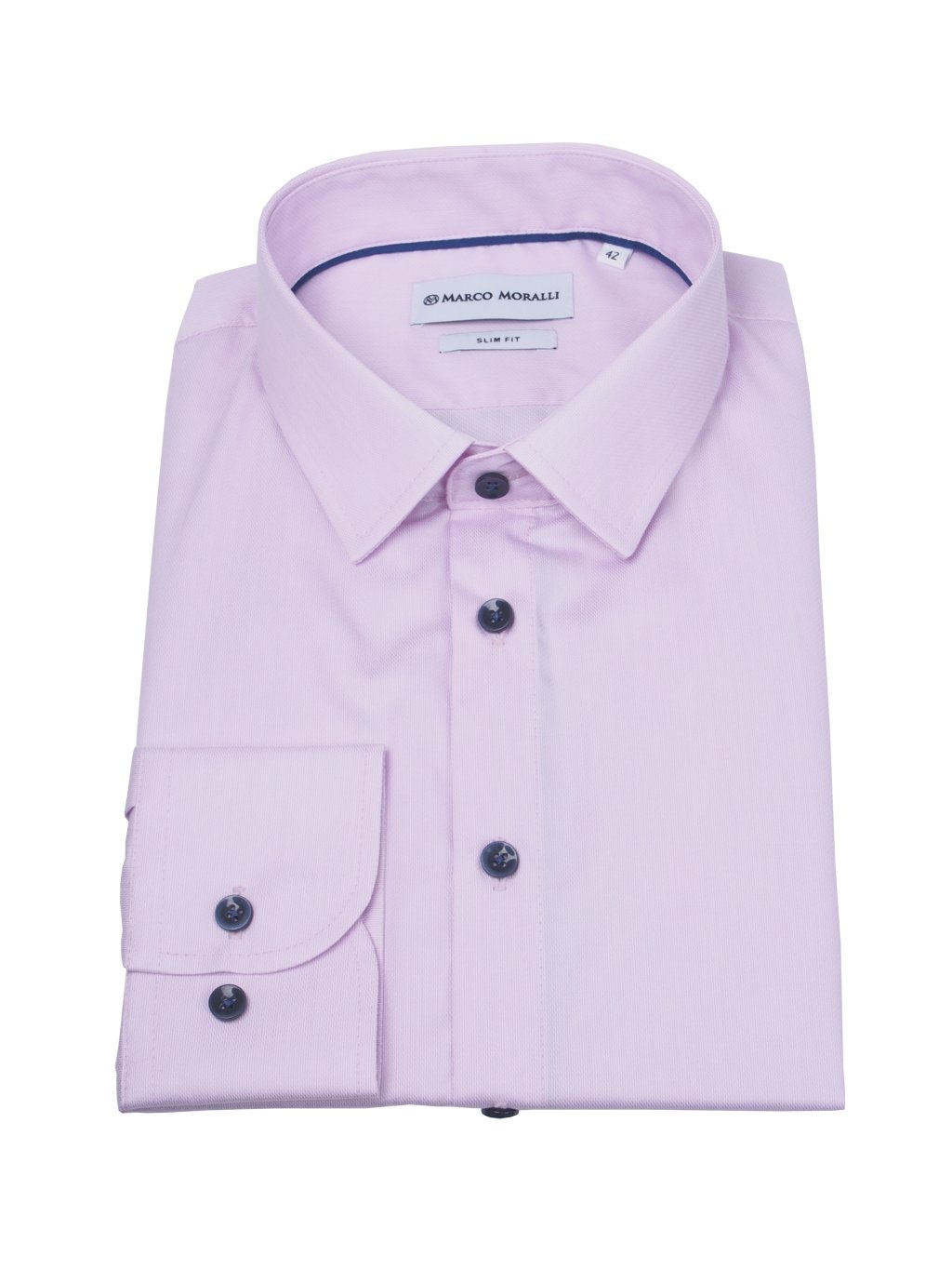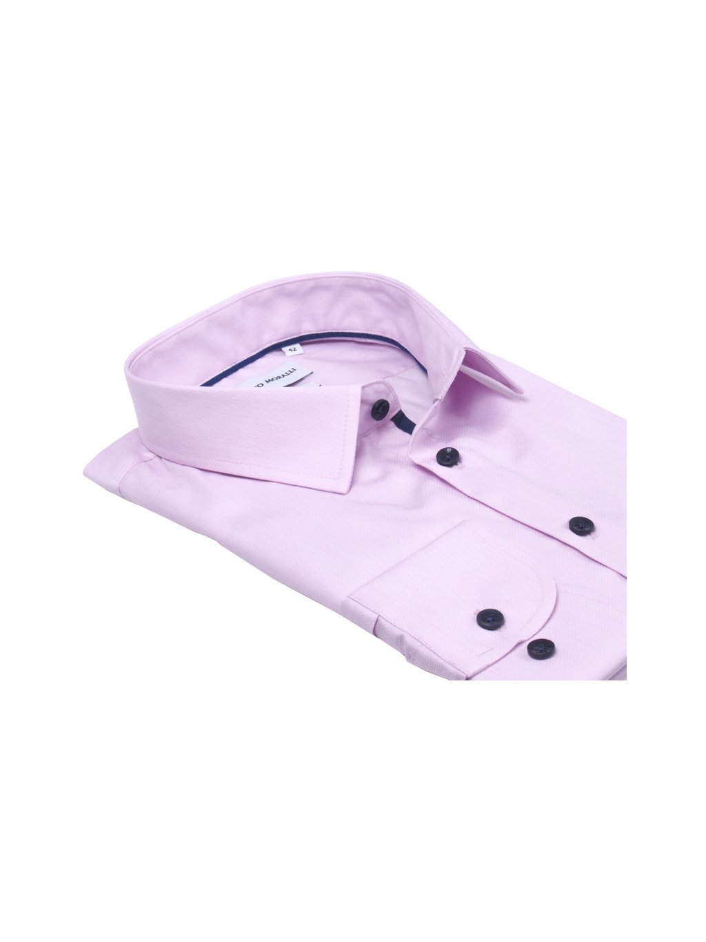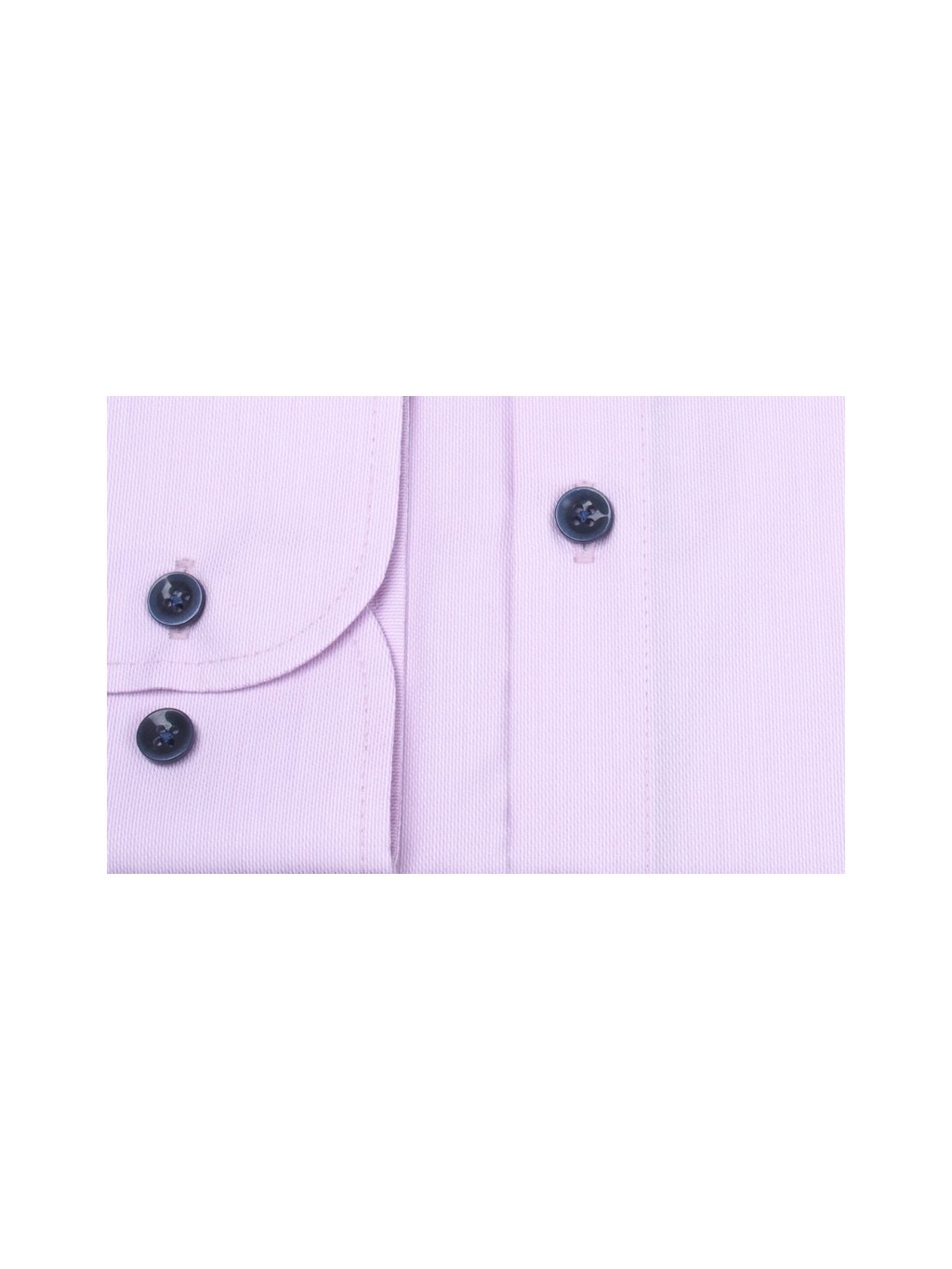 Elegantná ružová pánska košeľa doplnená v golieri tmavomodrou výpustkou, na spodnej lége úzkym lemovaním a spolu s tmavomodrými gombíkmi jej dávajú moderný elegantný vzhľad.