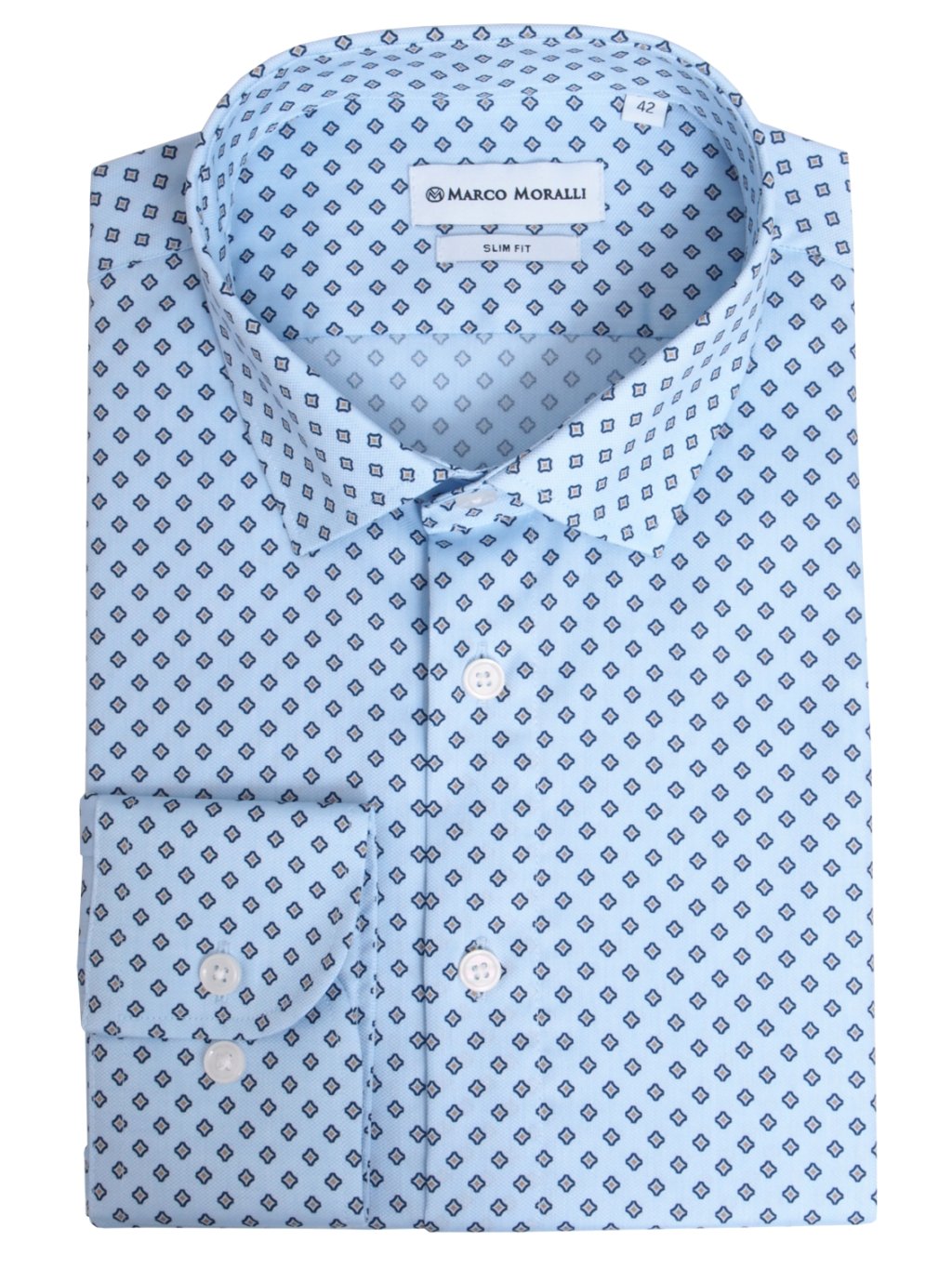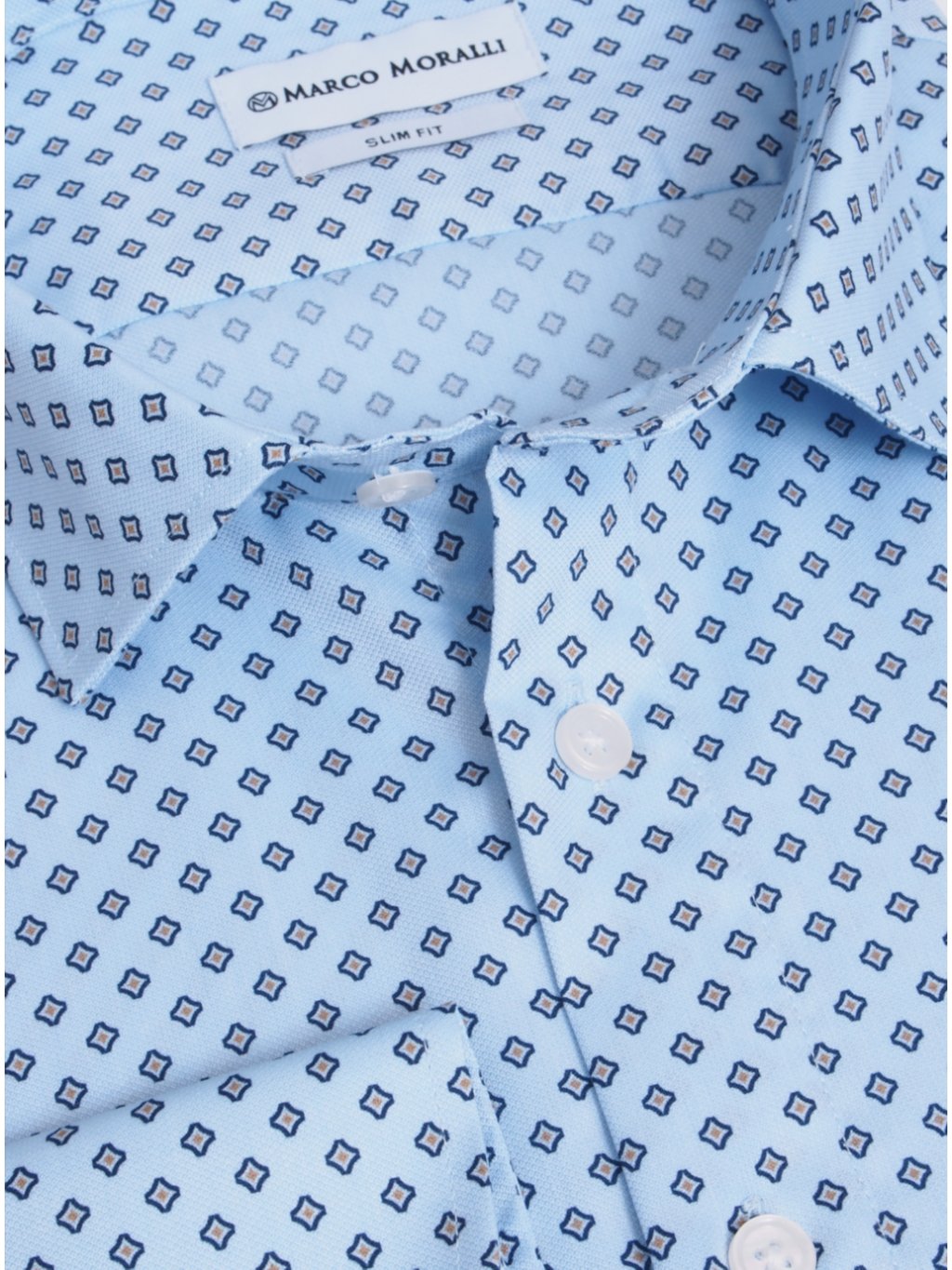 Pánska košeľa v modrej farbe je moderná a elegantná zároveň. Košeľa s dlhým rukávom a s jemným vzorom v trendovom štýle. Jemné bavlnené priadze spolu s pohodlným strihom Slim Fit pôsobia dokonale. Táto košeľa sa hodí na formálne i neformálne príležitosti.
