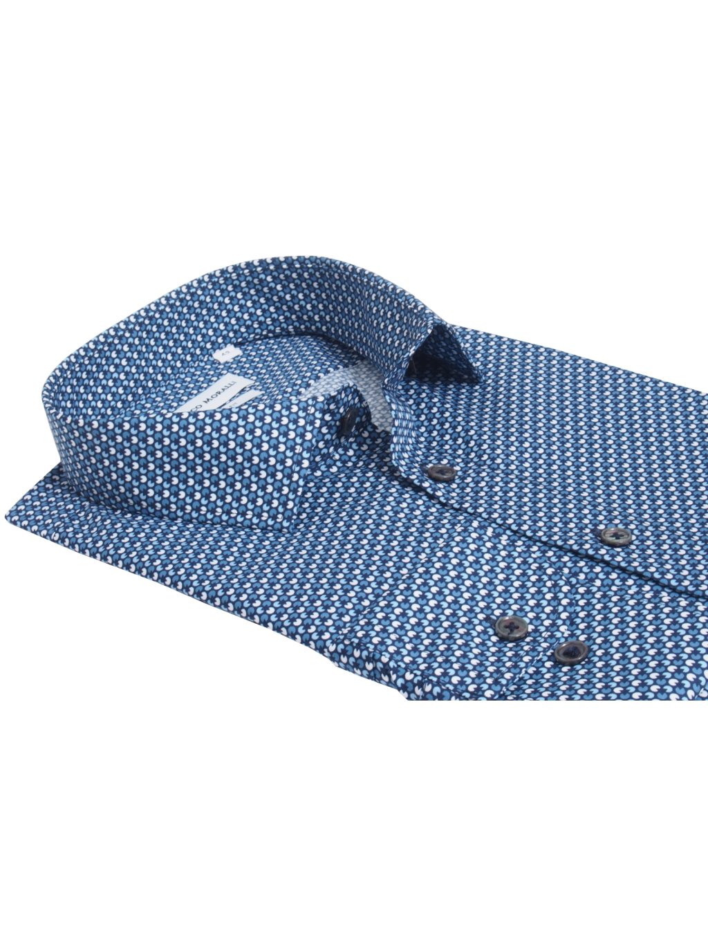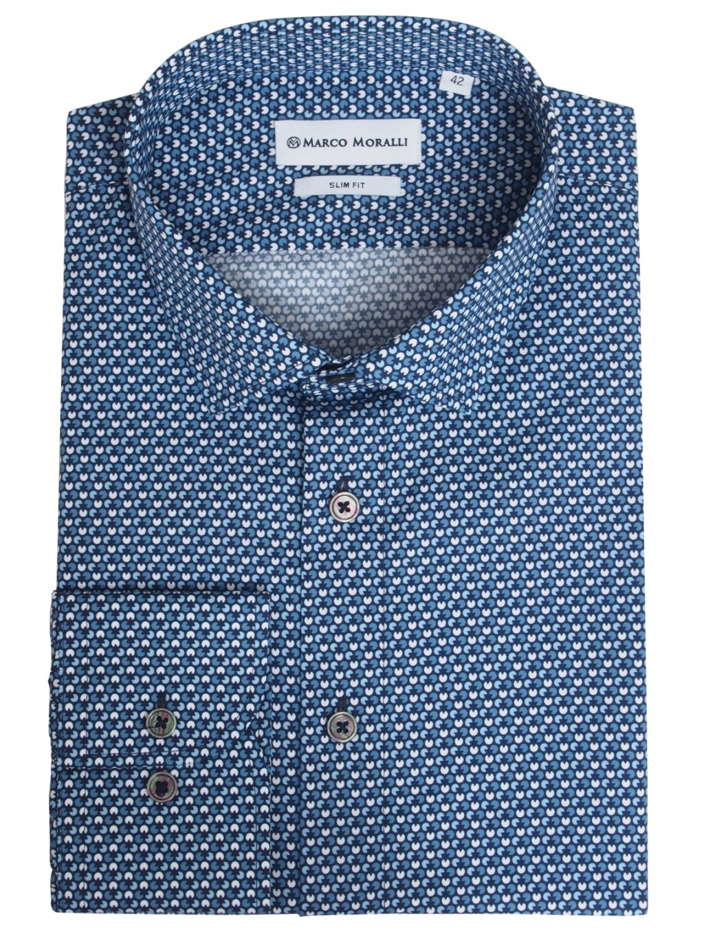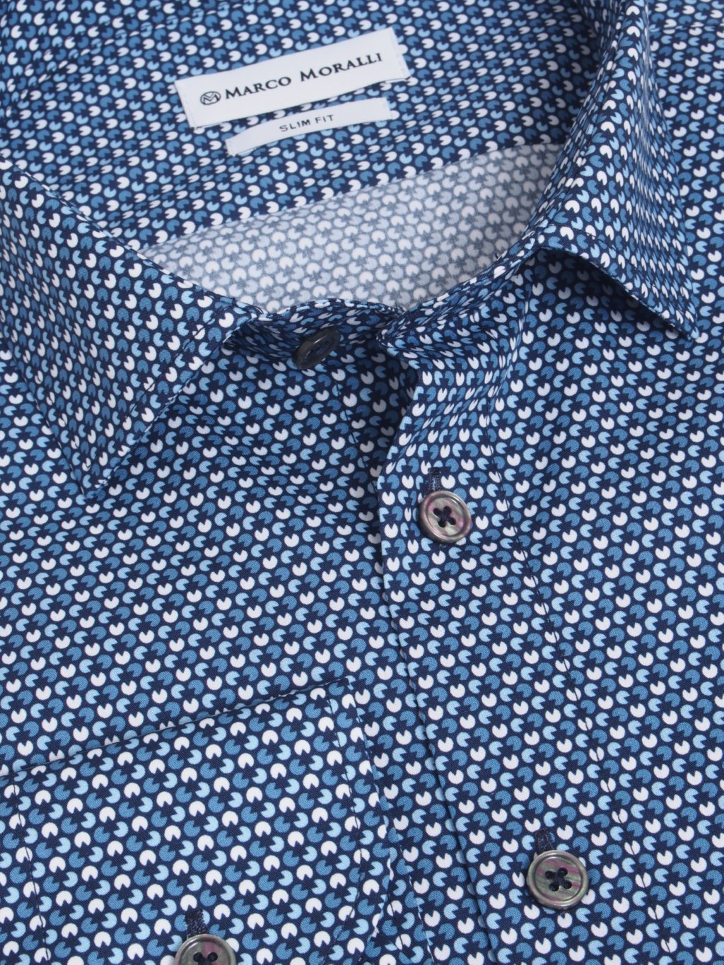 Elegantná pánska košeľa je v modrej farbe v tmavších tónoch. Príjemný bavlnený materiál s vysoko kvalitnou digitálnou potlačou je doplnený štýlovým vzorom. Pánska košeľa v strihu Slim Fit sa hodí na formálne i neformálne príležitosti.