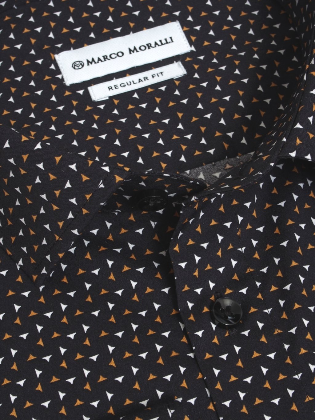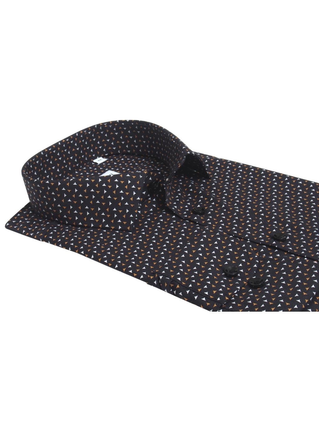 Pánska elegantná košeľa s dlhým rukávom a s klasickým golierom. Vyrobená je z bavlny a elastanu v strihu Regular Fit. Ideálna pánska košeľa do obleku. Elegantný minimalistický dizajn v hnedej a bielej farbe na čiernom podklade ju robí výnimočnou.