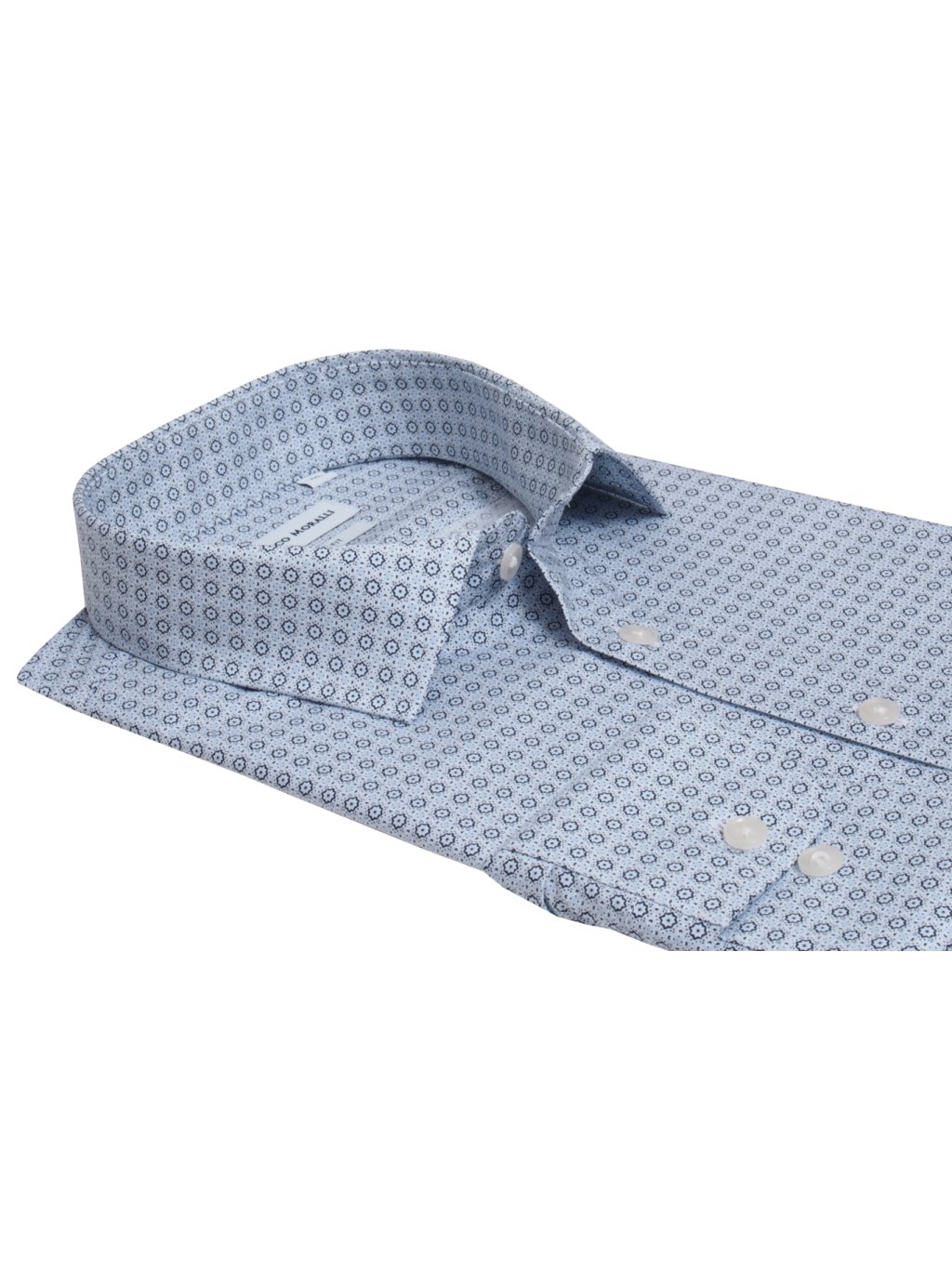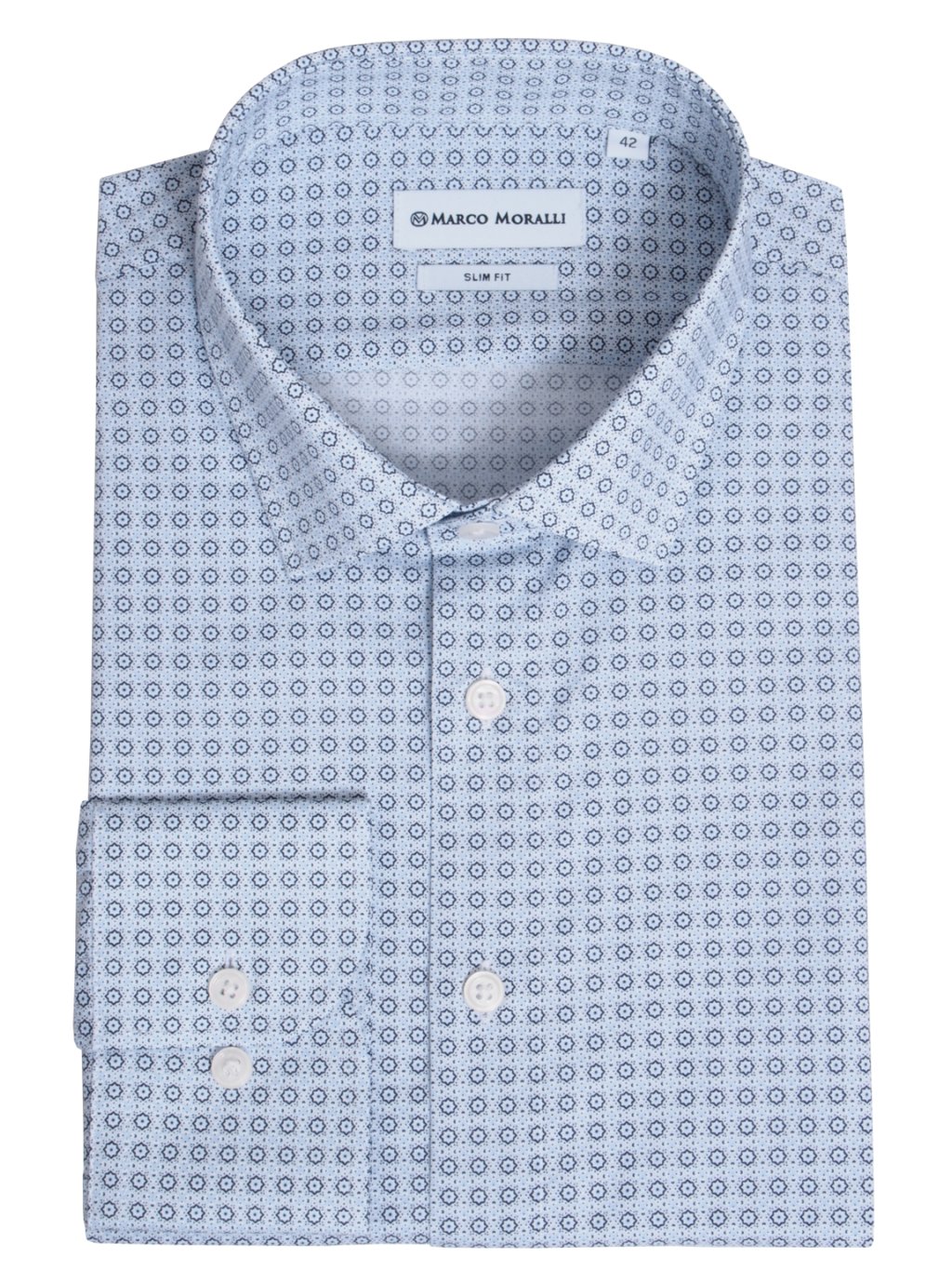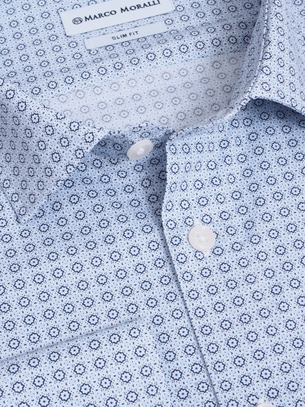 Pánska košeľa so strihom Slim Fit ponúka zvýšené pohodlie vďaka strečovej bavlnenej látke. Drobná geometrická potlač v odtieňoch modrej farby dodáva košeli moderný šmrnc. Skvelo sa hodí do pracovného obleku.