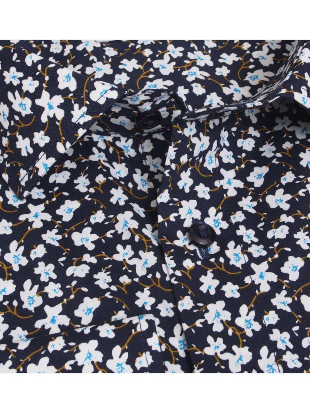 Zaujímavý kreatívny kvetinový vzor v čiernobielej farbe s jemnou modrou zaisťujú elegantný vzhľad, ktorý sa perfektne kombinuje k saku alebo džínsom.