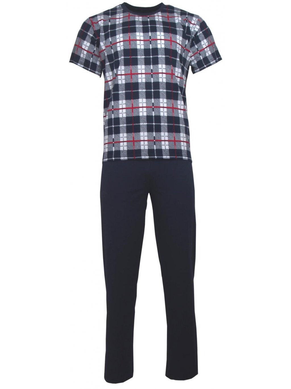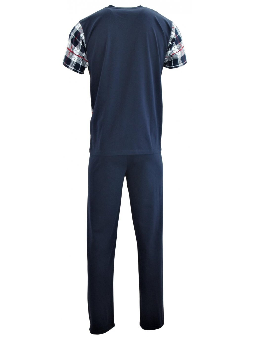 Pánske pyžamo tmavomodrej farby so vzorom na prednom diele a rukávoch. Pyžamo má vrchný diel s krátkym rukávom a okrúhlym výstrihom. Nohavice sú dlhé a pásec je spracovaný do gumy. Pyžamo je voľného strihu a pohodlné na nosenie.